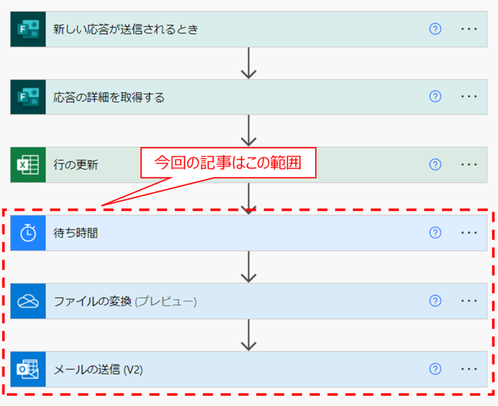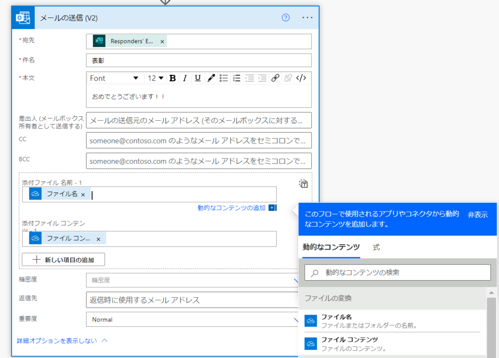 - 添付ファイル コンテンツ:動的なコンテンツ – ファイルの変換から”ファイルコンテンツ”を選択します。